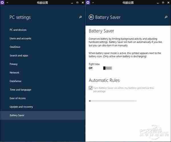 这项功能同样是为移动设备所设,在“电脑设置”(PC settings)最下方新增加了一项“电池省电模式”(Battery Saver)。具体来说就是当电量低于某一设定值时(页面下方那个滑杆),省电模式能通过限制一些后台应用开启及硬件设置调节,来节约平板电脑或笔记本的电力消耗。